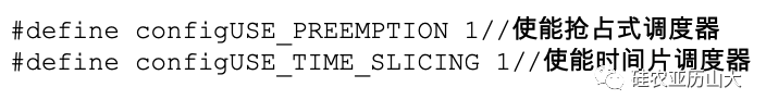 FreeRTOS中的调度算法分为时间片调度算法和抢占式调度,在FreeRTOS的FreeRTOSConfig.h文件中配置如下: