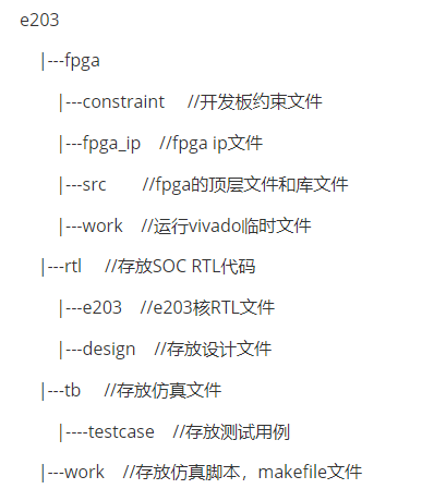 由于使用之后的开发板,并不是相应相应配套的开发板。所以这里只从e203中提取需要的RTL文件。建立一个自己习惯的工作目录,这里简单分享一下,我现在自己用的。FPGA的移植之后会分享给大家,欢迎大家持续关注。