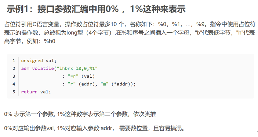 上述例句输入输出操作数部分中,““内为限制字符串用于限制操作数变量的属性,”=“表示变量用作输出,”r”表示该操作数对应一个寄存器。“()”中写操作数在C/C++代码中对应的变量或者表达式。