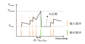 如图所示展示了LIF神经元的膜电势Vmem随时间戳timestamp动态变化的过程,当接收到输入脉冲后,LIF神经元的膜电势值Vmem便会升高,直至达到阈值电压Vthersh,此时神经元产生输出脉冲,这个过程被形象的叫做“积分点火”,释放输出后,Vmem便立刻变为Vrest。然后进入不应期,在不应期内无论是否接收到输入脉冲,其膜电势都保持静息电位。此外在一段时间内若没有接收到输入脉冲,膜电势也会发生泄漏而降低。