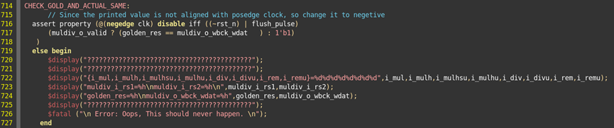 意外的,程序会产生自检报错(实际上这个报错在原工程中也会出现),通过info我们可以看到错误在e203_exu_alu_muldiv模块中产生,产生错误的指令为i_div,操作数rs1的值为ffff_ffec,操作数rs2的值为0000_0006,黄金参考结果golden_res的值为5555_5552,而我们的计算结果为ffff_fffd。我们使用电脑自带的计算器进行计算,其中rs1的十进制表示为-20,rs2的十进制表示为6,结果应当为-20/6=-3,转换为十六进制为ffff_fffd,这与我们的结果是一致的,而代码中的自检产生了错误,可以暂时注释掉代码中的自检部分: