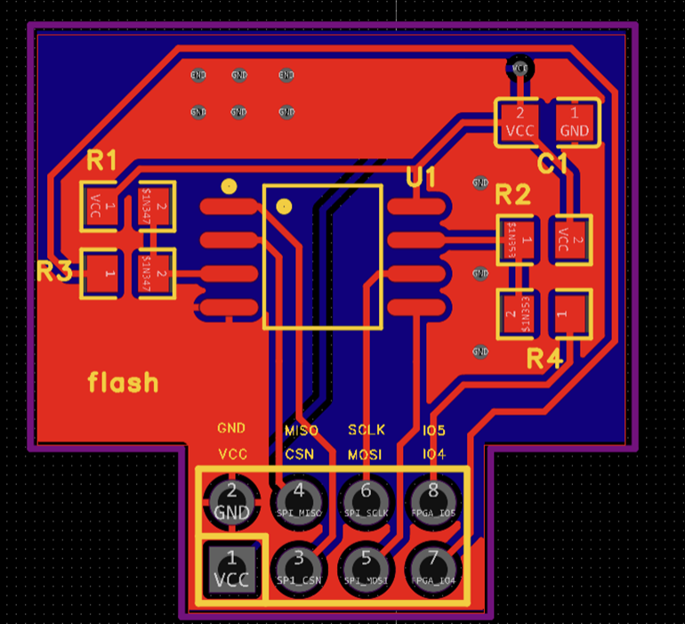 由于队伍没有成功购买本项目配套的开发板,使用了自行购置的正点原子FPGA开发板,正点原子的开发板只有一块FLASH(芯来提供的板子上搭载两块)于是我们额外搭建了外置的flash,原理图与PCB文件如下图所示我们上电烧录程序发现运行正常