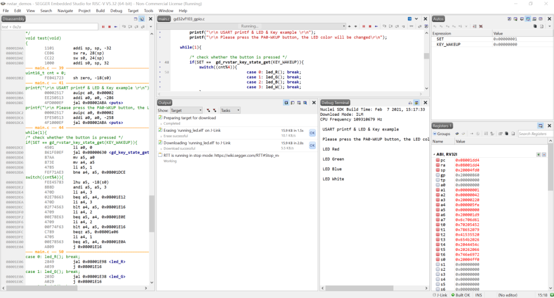 本教程以板上按键控制点亮RV-STAR开发板上的LED为目标,从IDE的下载安装开始详细介绍了使用SEGGER Embedded Studio+JLink调试器进行RISC-V嵌入式开发的方法。