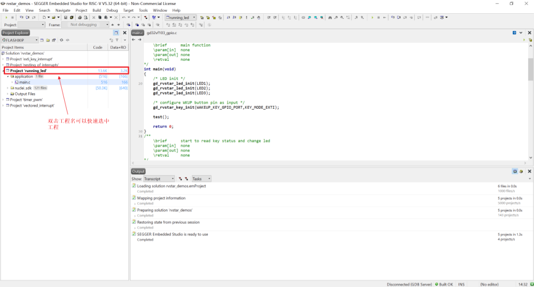 双击Project ‘running led’选中running_led工程,直接按f5即可进入调试模式。