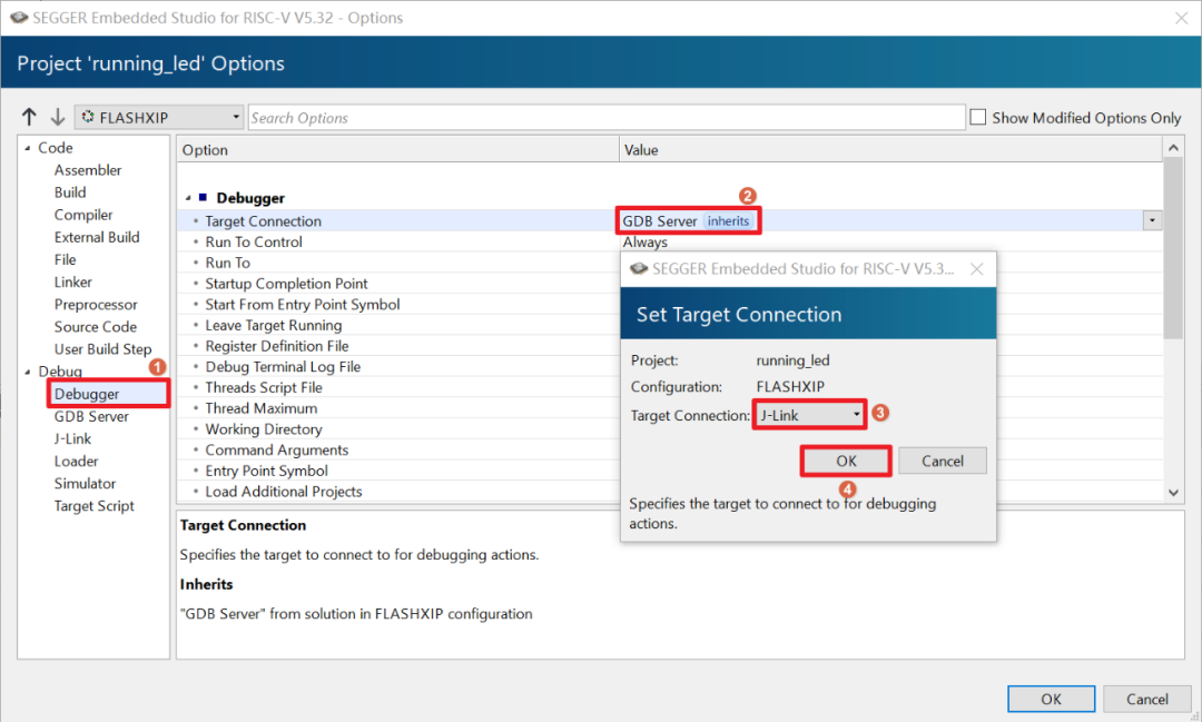 右击当前工程名,选择“Options”打开工程设置页面。选中Debugger,双击Target Connection选项,在弹窗中切换为J-Link,点击OK完成设置。