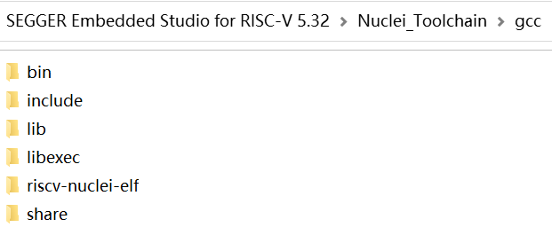 在新建的Nuclei_Toolchain文件夹里面放入解压好的工具链,直接解压后还需修改一下文件夹层级和文件夹名。文件名修改成gcc,并且要求下一级文件夹是bin文件所在层级,可参考以下截图:
