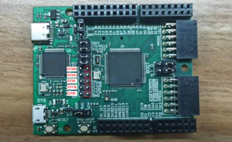 使用JLink调试RV-STAR需要移除开发板上的五个短接帽,如下图中红框所示。连接时如果看不清图中文字,可以参考板上的丝印。