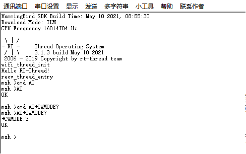 随后实现AT指令发送,为了方便指令测试,将cmd函数导出到msh中,这样可以在RT-Thread运行过程中通过终端直接发送指令到wifi模块。比如通过输入"cmd AT"加回车键,把AT指令发送到wifi模块,将接收并打印“OK”字符,表示模块可以正常访问。