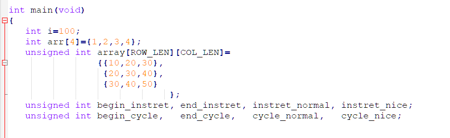 这是主程序的开始位置,这一部分用C语言定义了一个二维数组array作为数据输入。