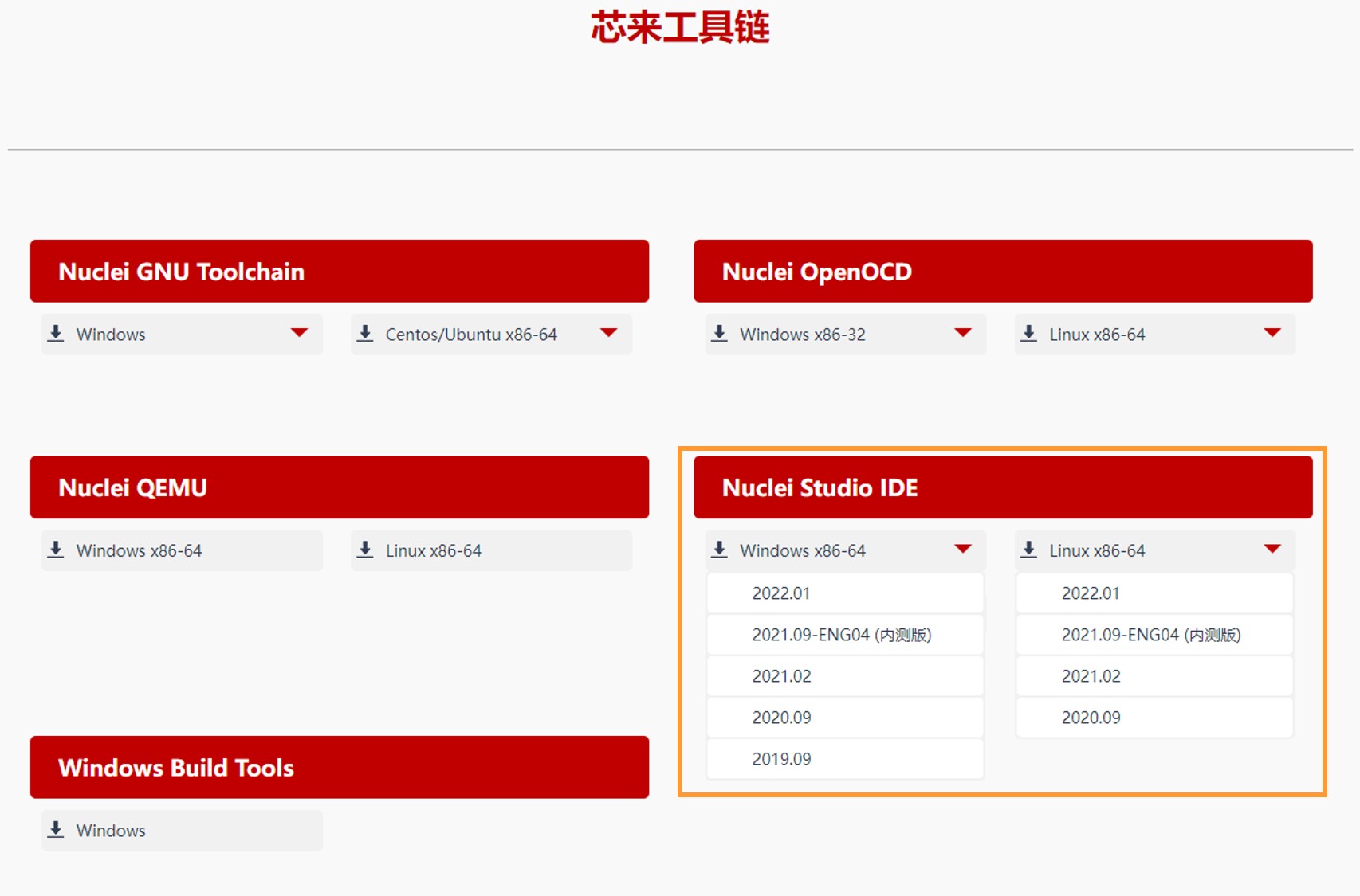 用户可以访问芯来科技公司官方网站的“文档与工具”页面(https://www.nucleisys.com/download.php),如下图中方框所标识,根据用户开发环境,下载对应Windows或Linux的Nuclei Studio压缩包。