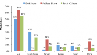 根据ICinsights报告显示,统计IDM、Fabless的集成电路市场份额,美国遥遥领先。 (